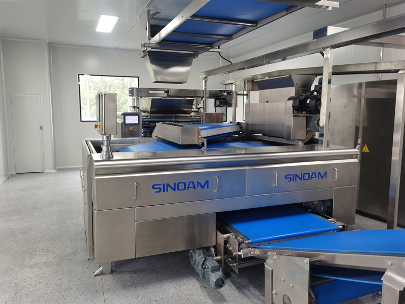 配合喂料機(jī)將軋薄的面皮切片并依次疊加至8~16層,并輸送至成型軋輥,該機(jī)能將回面始終處于面皮底部,經(jīng)切片式疊層機(jī)生產(chǎn)出來(lái)的餅干層次感強(qiáng)、口感松脆、酥化程度極高,配合機(jī)器上的撒酥機(jī),可生產(chǎn)蘇打餅干和其它高檔餅干。